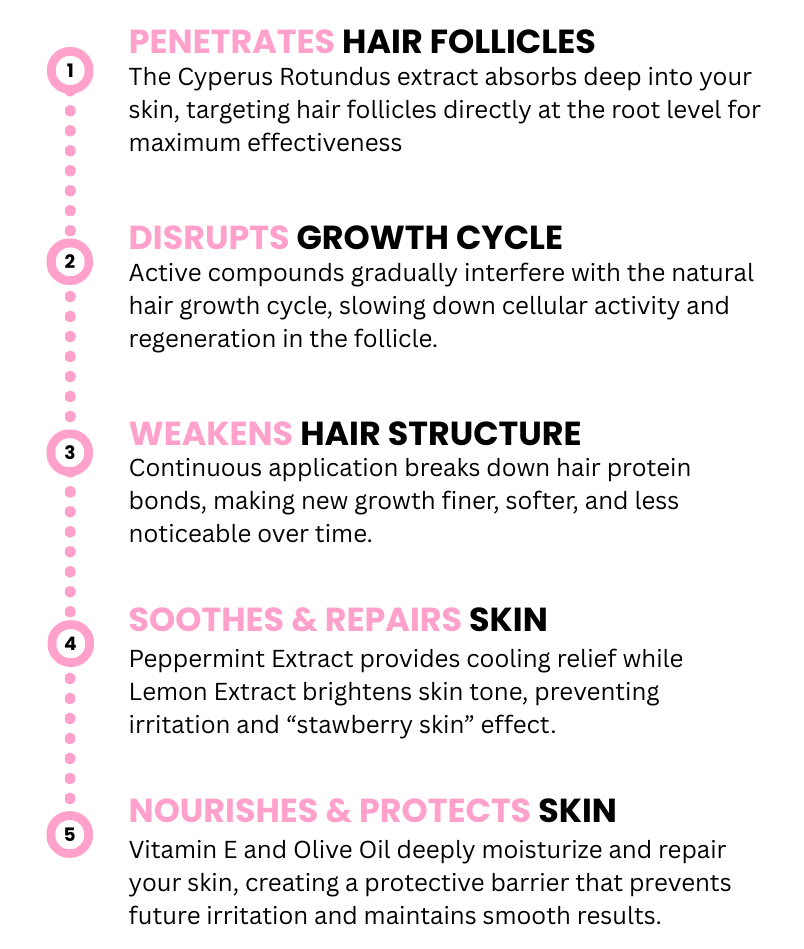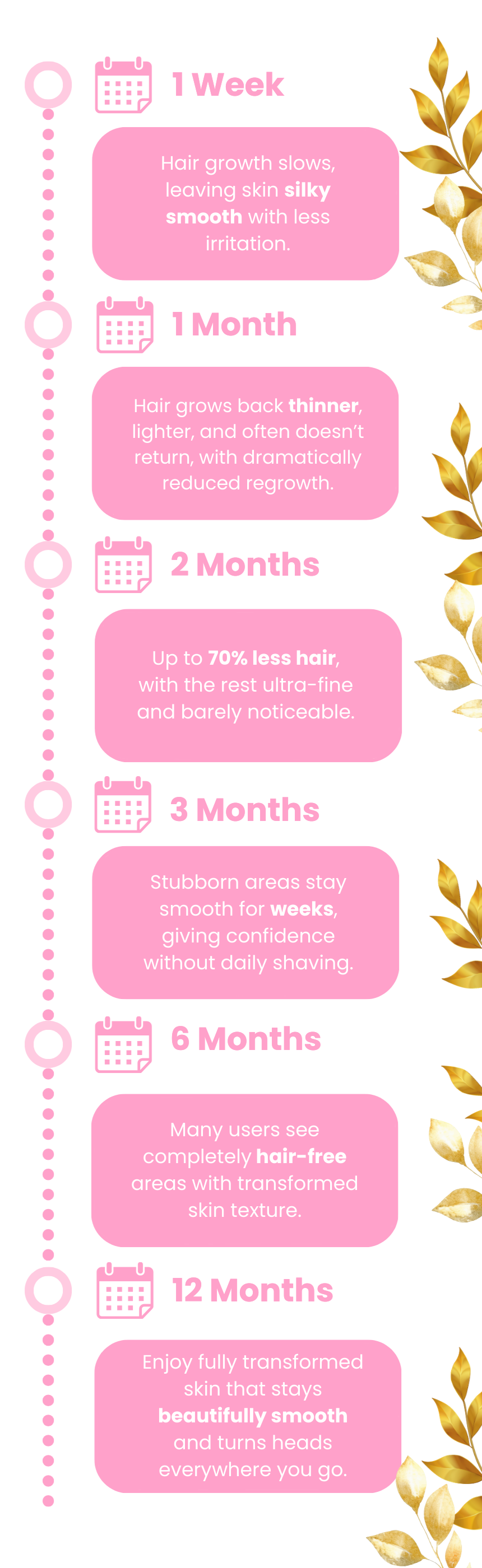 Most users notice slower and finer regrowth within 1-2 weeks of consistent use. With consistent long-term use, many customers report dramatic reduction in hair growth that lasts even with less frequent applications. Results improve over time with regular use.